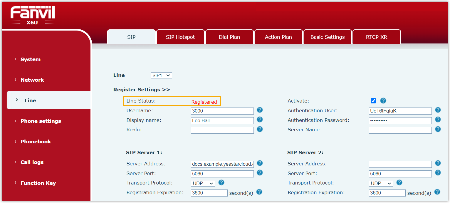 This topic takes Fanvil X6U-V2 (firmware: 2.12.1) as an example to introduce how to manually register an extension on a Fanvil IP phone.